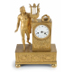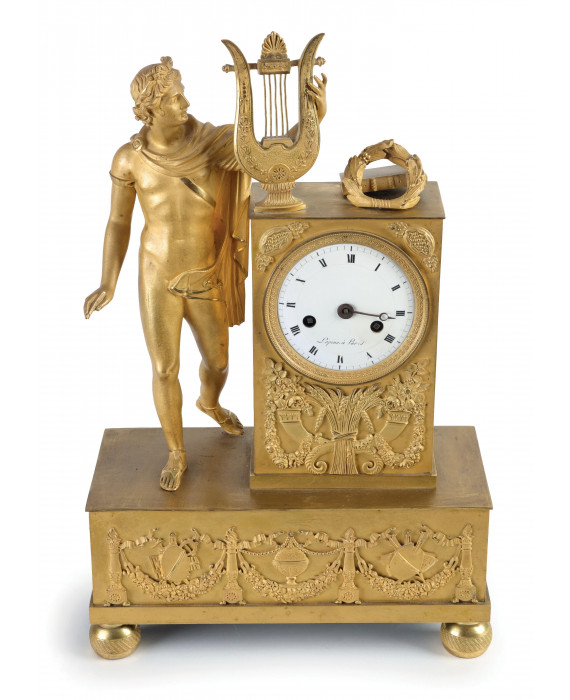 Orologio da tavolo in bronzo dorato finemente lavorato con festoni di frutta, trionfi musicali, nastri, cornucopie, fasci di spighe e personaggio classico con lira. Quadrante in smalto bianco firmato Lepine a Paris. Francia, sec. XIX. cm39x25x12 (da revisionare e mancante di una lancetta)