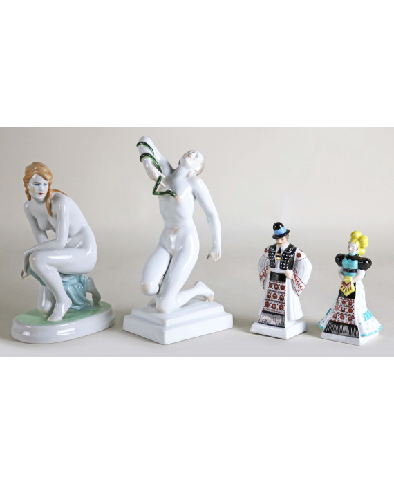 Lotto di quattro statuine in porcellana: tre marcate Herend raffiguranti Cleopatra e coppia di personaggi in abiti tradizionali ed una raffigurante nudo di donna marcata Pecs. Alt. cm25/15(2)/23