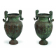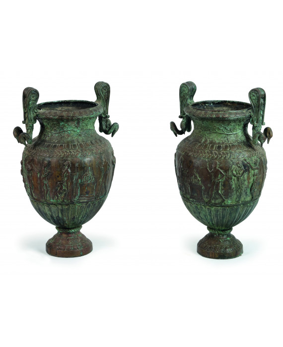 Coppia di grandi urne in bronzo patinato lavorate in stile neoclassico con scene rituali, anse a collo di cigno, base tonda. Alt. cm88