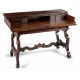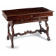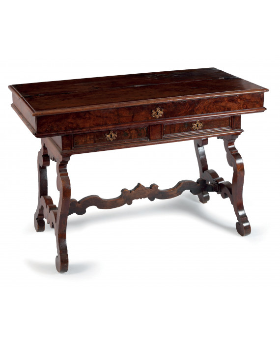 Scrittoio San Filippo in legno di noce con due sostegni a lira raccordati da traversa modanata, piano apribile con all'interno quattro cassettini, vano a giorno e segreti, due cassetti inferiori. Italia centrale sec. XVII. cm96x136x70