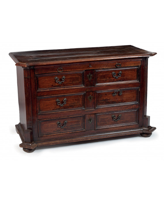 Canterano a tre cassetti in legno di noce con filettature in legni chiari. Toscana, sec. XVII. cm93x154x70 (lievi difetti e mancanze)