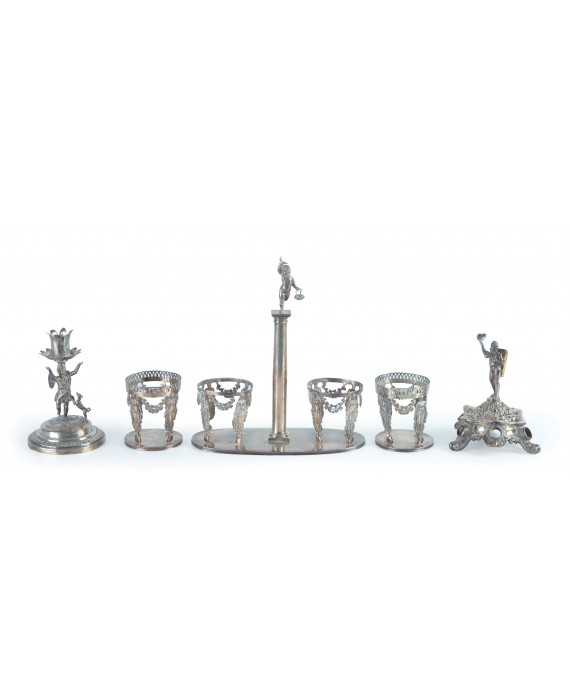 Lotto di cinque oggetti in argento: una bugia lavorata con putto alato e cane con fasce a palmette. Bolli Roma, inizi sec. XIX; Un particolare porta stuzzicadenti sbalzato con tralci d'una e con contadino con cesta. Bolli Firenze, sec. XVII/XVII; Una oliera lavorata con cariatidi e festoni floreali con putto su colonna centrale , bolli Francia 1809-1019; una coppia di salierine lavorate con festoni e cariatidi degli inizi del sec. XIX con bolli illeggibili. Peso tot. gr. 750 (bugia con foro alla base e lievi difetti)