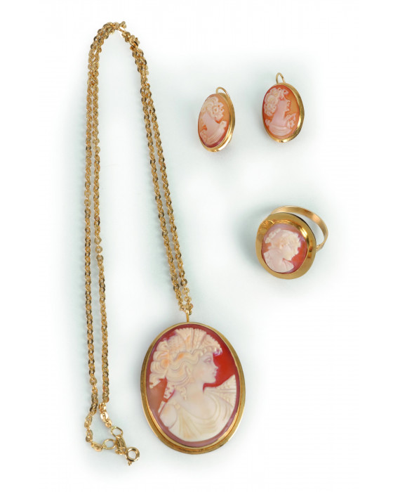 Parure in oro giallo 18Kt con cammei intagliati con profili, composta da una collana, un anello ed un paio di orecchini. Peso tot. gr. 26,6. Misura anello 21. Allegata dichiarazione di autenticità a cura della gioielleria Ci&Ci