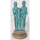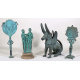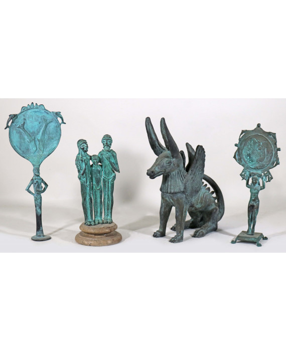 Omero Bordo ( Tarquinia 1943-2018). Lotto di quattro riproduzioni etrusche in bronzo patinato raffiguranti un grifone, due specchi, ed un gruppo di personaggi . Alt. cm40/44/37/29
