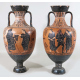 Omero Bordo ( Tarquinia 1943-2018). Coppia di riproduzioni di anfore etrusche in terracotta, dipinte con personaggi. Alt. cm64