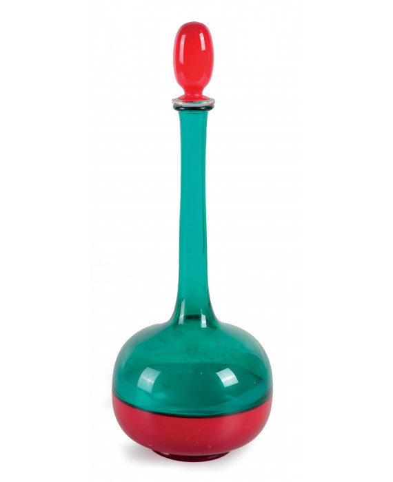 Gio Ponti (1891-1979). Bottiglia Mornadiana ad incalmo nei toni del verde e del rosso, firmata sul fondo Venini 87. Alt. cm34