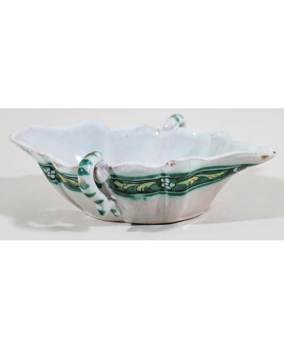 Saliera biansata in maiolica dipinta nei toni del verde con serti floreali. Cerreto Sannita, sec. XVIII. cm4x17x13