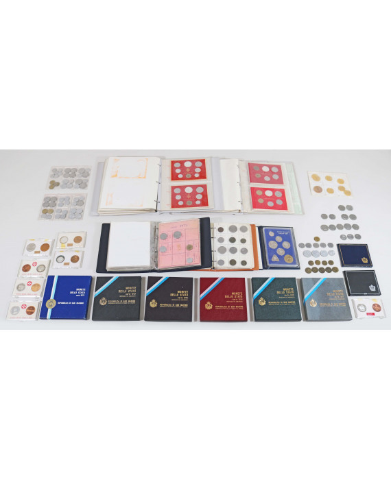 Lotto di numerose monete del Regno d'Italia e della Repubblica Italiana, tra cui molte in argento e vari divisionali, di cui sei della Repubblica di San Marino dal 1972 al 1977, 20 dello Stato Città del Vaticano, sette del Sovrano Militare Ordine di Malta e 13 dell Repubblica Italiana dal 1968 al 1980 . Peso tot. dell'argento, gr. 650 circa