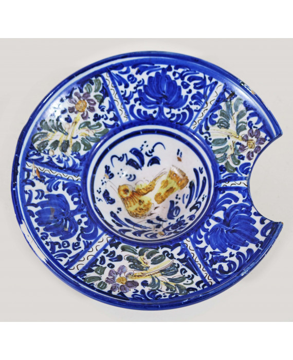Conca da barbiere in maiolica dipinta con uccello e riserve floreali. Spagna, sec. XIX. Alt. cm9; Diam. cm26 (restauro)
