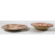 Lotto di un bacile smaltato bianco dipinto a lustro rosso con larga foglia centrale e piccoli garofani alle estremità, produzione di Manises del sec. XVIII ed un piatto con bugnatura centrale in smalto avorio dipinto a lustro color ruggine con caseggiati, produzione di Manises del sec. XVII. Diam. cm30 ( bacile restaurato con abrasioni al bordo); diam. cm35 (piatto da restaurare con ampie mancanze agli smalti e alla pittura)