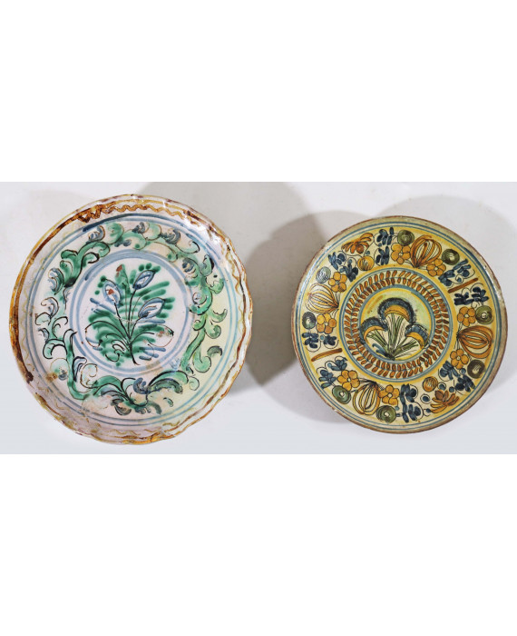 Lotto di due alzate in maiolica dipinta con serti vegetali e fiori. Area urbinate, sec. XVIII. Diam. cm23/24 (restauri e scheggiature)