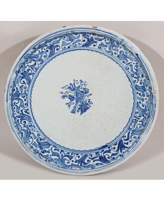 Alzatina in maiolica a fondo bianco dipinta in blu con uccellino tra i fiori e riserva vegetale sulla tesa. San Quirico Dorcia, sec. XVIII. Alt. cm6, Diam. cm29 (mancanze alla base e scheggiature al bordo)