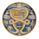 Alzatina in maiolica dipinta in blu cobalto e giallo con draghi intrecciati, sormontati da un putto alato, che inquadrano un motto parzialmente leggibile ed un stemma araldico, ai lati targa S.P.Q.R., data 1545 e trionfi d'armi. Castel Durante, sec. XVI. Diam. cm22 (abrasioni al bordo, restauro pittorico centrale e antico restauro con grappa a filatura posteriore)