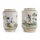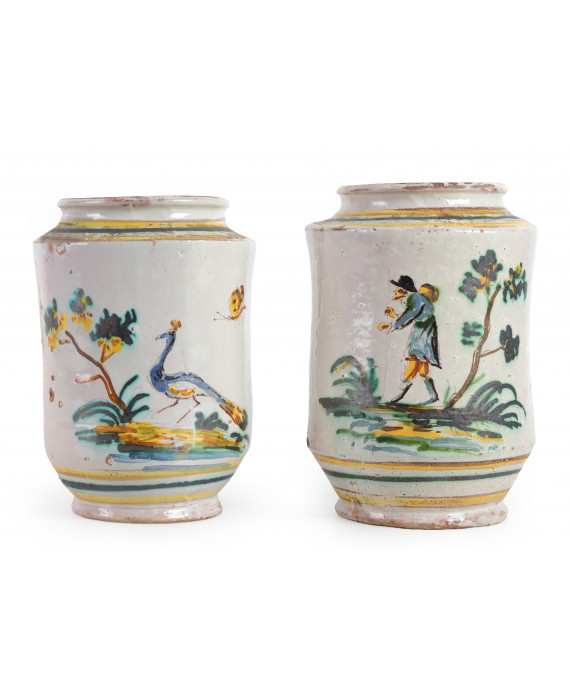 Lotto di due albarelli similari in maiolica a fondo bianco dipinta in verde e giallo con caseggiati, viandante e pavone con farfalla. Liguria, sec. XVIII. Alt. cm24/25 (scheggiature)