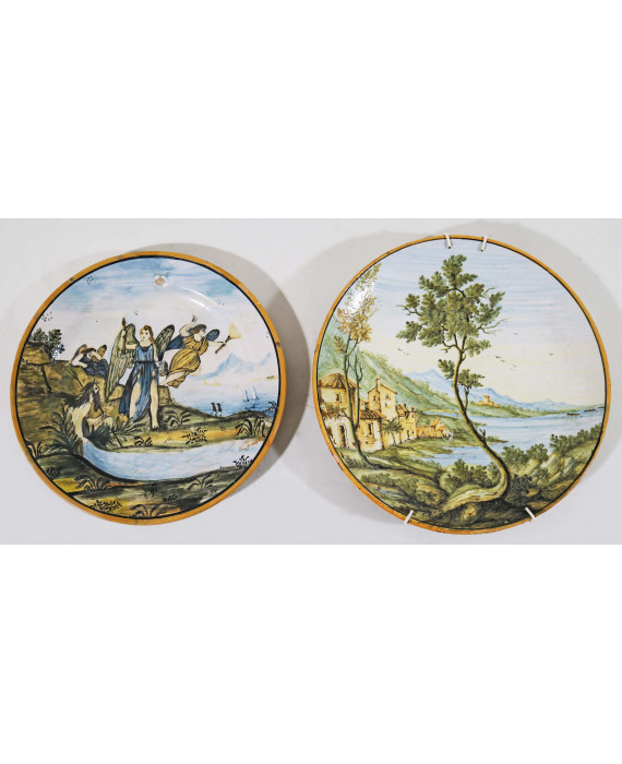 Lotto di due piatti in maiolica dipinta con paesaggio lacustre e caseggiati, marchio illeggibile graffito sul retro, e scena mitologica con veduta, marchio dipinto sul retro. Castelli, sec. XIX. Diam. cm24/23