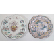Lotto di due piatti in maiolica: uno dipinto con caseggiati, personaggi e stemma araldico centrale con motto ed uno dipinto con elementi architettonici e motivi floreali. Savona, sec. XVIII. diam. cm23/22 ( restauri al piatto stemmato)