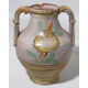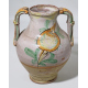 Lotto di un catino in terracotta a fondo giallo con beccuccio a testa zoomorfa, centro Italia sec XIX, un boccale ed un vaso biansato in maiolica dipinta con frutta e racemi vegetali, manifattura del sud italia del sec. XIX. Alt. cm34/20/28 (piccoli restauri e scheggiature)