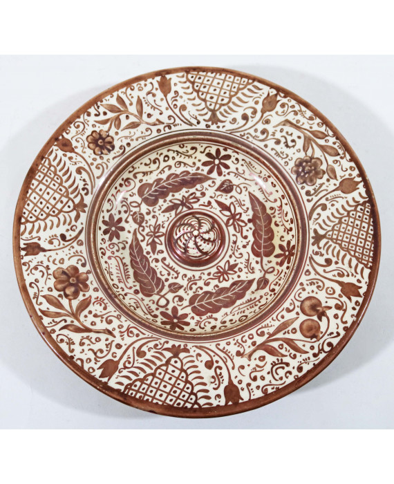 Piatto in maiolica a lustro con bugnatura centrale dipinto con fiori, frutta e serti vegetali. Spagna, Manines, sec. XIX. Diam. cm30