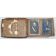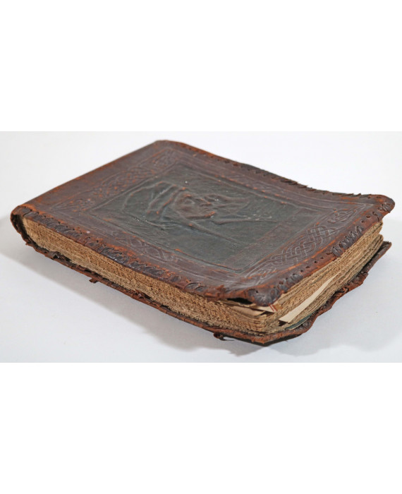 Album fotografico in cuoio decorato con figura di Dante a rilievo, contenente oltre 90 cartoline ritraenti personaggi, tra cui Benito Mussolini. Anni '30 (difetti all'album)