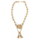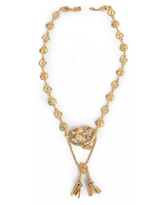 Collana in oro giallo 14kt decorata con smalti nei toni del blu, con due ciondoli inferiori. Peso tot. gr. 22,3. Allegata dichiarazione di autenticità a cura della gioielleria Ci&Ci