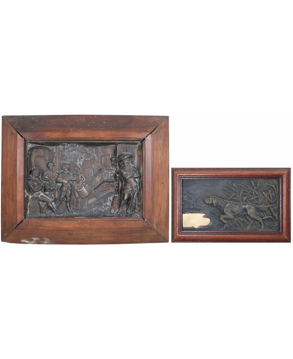 Lotto di due bassorilievi in bronzo patinato: uno raffigurante scena d'interno con musicanti ed uno raffigurante cane da caccia, con cornici. cm24x37/18x32