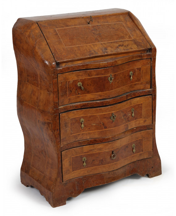 Piccola ribalta impiallacciata in legno di noce, calatoia con allinterno quattro cassettini e sportello, tre cassetti inferiori, fronte laterali mossi. cm95x75x40 (difetti)