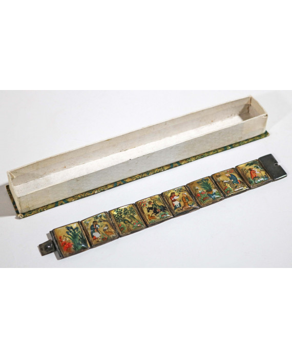 Bracciale in argento composto da otto tessere in madreperla incastonate e dipinte con fiori, animali e scene di vita. Manifattura persiana, inizi sec. XX. Lungh. cm20 (mancanze alla pittura)