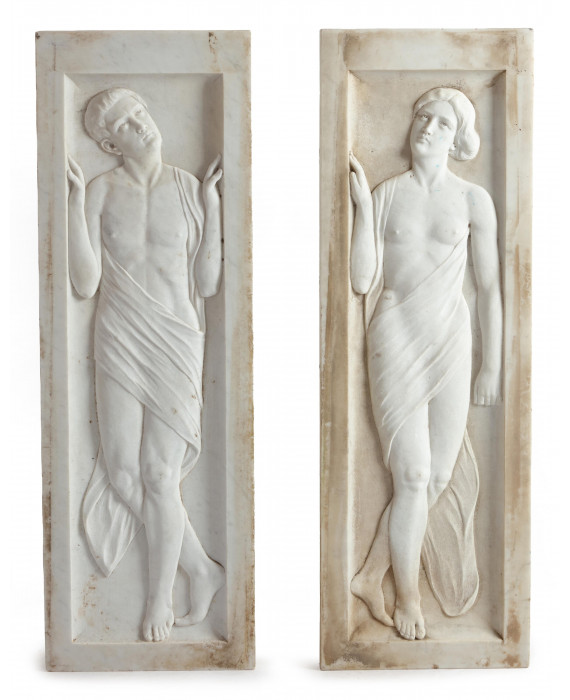 Coppia di lesene in marmo bianco scolpite a bassorilievo con figure neoclassiche. Italia, periodo Decò. cm97x32x5