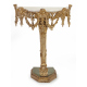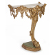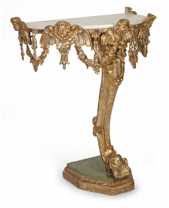 Consolle in legno dorato ed intagliato con cherubini e serti floreali, sostegno centrale a voluta terminante su base inferiore, piano in marmo (non coevo). cm102x85x55 (lievi difetti)