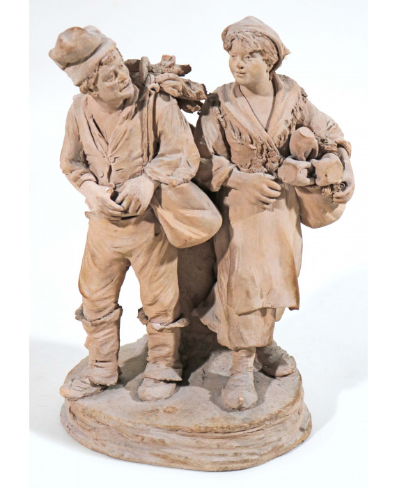 Giacomo Vaccaro (1847-1931). Gruppo in terracotta raffigurante due contadini, firmato alla base Cav. G. Vaccaro Caltagirone. Alt. cm25 ( piccole mancanze))