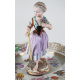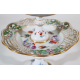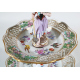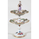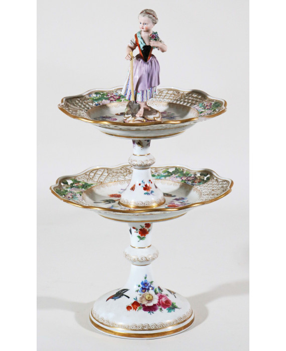 Alzatina in porcellana traforata e dipinta con fiori ed uccelli, due ripiani traforati terminanti con statuina di contadinella. Meissen, fine sec. XIX. Alt. cm43