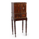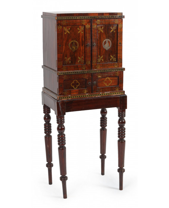 Monetiere impiallacciato in legno di palissandro ed intarsiato in metallo dorato, due sportelli con all' interno quaranta cassettini portamonete, due sportelli inferiori con quattro cassettini interni, quattro gambe tornite. cm136x55x38 (difetti e mancanze)
