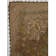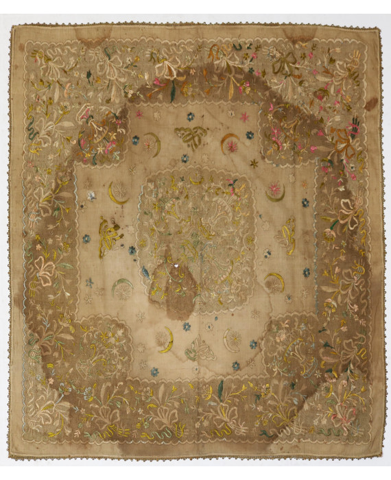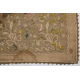 Prezioso tessuto broccato in filamenti in oro e seta, ricamato con nastri, fiori, mezzelune e ideogrammi. Turchia, sec. XVIII. cm114x118 (macchie, foro)