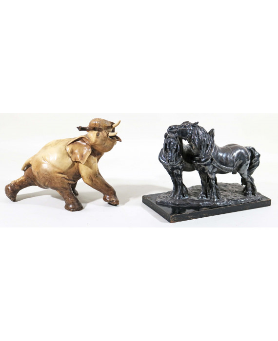 Guido Cacciapuoti (1892-1953). Elefante; Cavalli in sosta. Lotto di due sculture in terracotta, di cui una rivestita in argento su base in legno, firmate in basso. Lungh. cm43/36 (scheggiature e piccolo restauro all'elefante)