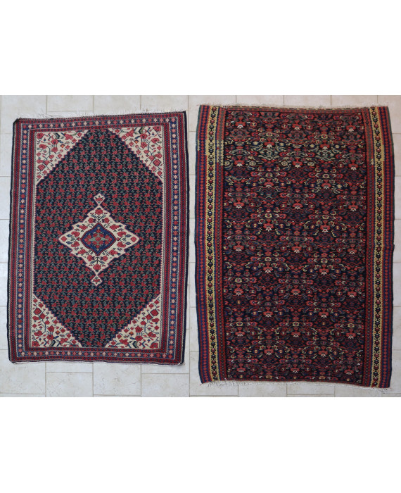 Lotto di due tappeti ad ornati geometrici: un Kilim ed un Seneh. cm191x125/171x113