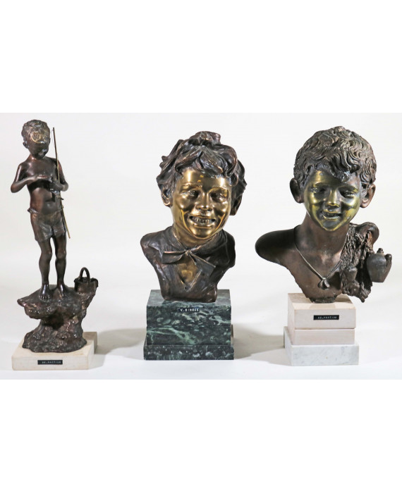 Lotto di tre fusioni in bronzo patinato su basi in marmo: Vincenzo Cinque (1852-1929). Busto di scugnizzo con fazzoletto al collo, firmato sul lato; Giovanni de Martino (1870-1935/38). Busto di acquaiolo e Pescatorello, firmati sul retro. Alt. cm34(2)/45