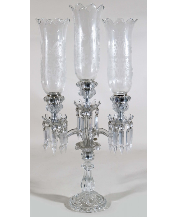 Flambeau a tre fiamme in cristallo di Baccarat con bobeches incise. Alt. cm71 (lievi scheggiature ai pendenti)