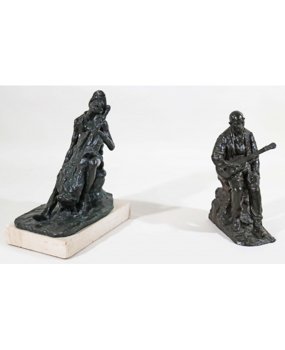 Lotto di due fusioni in bronzo patinato: Raffaele Belliazzi (1835-1917). Suonatore di chitarra, firmato sul lato; A. Lattarulo. Suonatore di viola, su base in marmo, firmato in basso. Alt. cm31/29