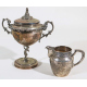 Lotto di un'oliera completa di ampolle in vetro, una zuccheriera, una lattiera e due tazze con piattino, in argento 800. Peso tot. dell'argento 1440 (zuccheriera mancante di bolli)