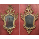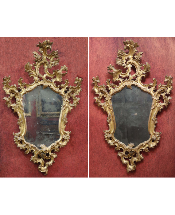 Importante coppia di specchiere in legno dorato interamente intagliate e traforate a volute vegetali e rocaille, fiori ed uccelli. Venezia, sec. XVIII. cm140x88 (restauri ad una)