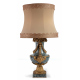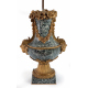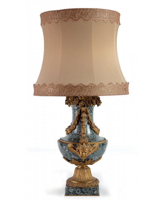 Importante lampada da tavolo con corpo a vaso in Diorite Orbitale (Corsite), interamente arricchita da serti di fiori e di frutta, cordonature, foglie d'acanto e foglie lanceolate, anse a testa di silfide. Francia, sec. XIX. Alt. cm53 (mancante di braccia porta candele)