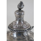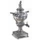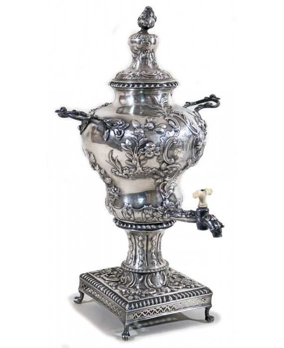 Importante samovar in argento interamente sbalzato con volute rocaille, rami fioriti, pagode e personaggi orientali, anse a ramo, base quadrata con ringhierina e peducci azampa. Bolli Britannia, città di Dublino, prima metà del sec. XVIII. Alt. cm50; Peso gr. 2850 (escluso bruciatore in metallo interno)