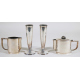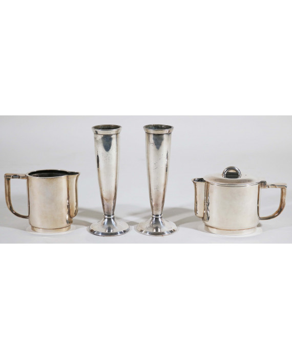 Lotto di quattro oggetti in metallo argentato: una coppia di bicchieri Soliflore, disegnati da Giò Ponti per Krupp Milano, 1930 circa; una caffettiera ed una lattiera marcate sul fondo Berndorf