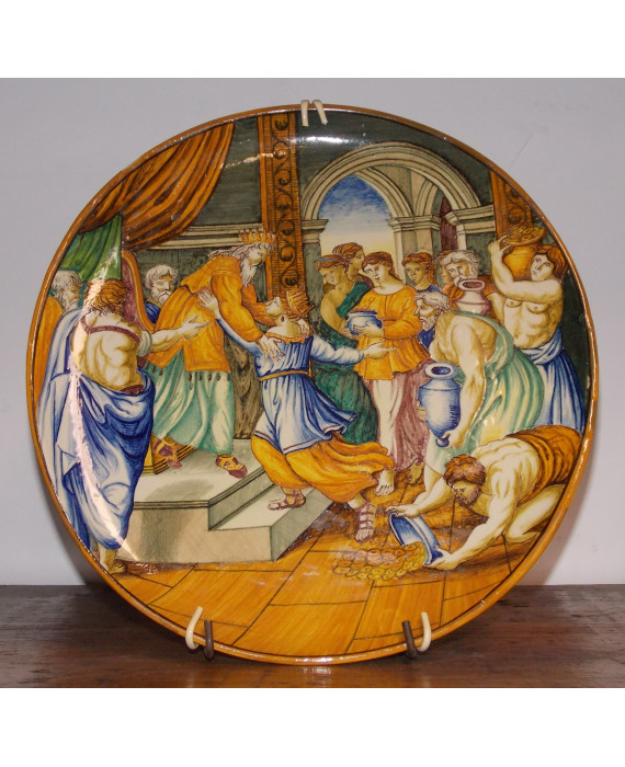 Piatto in maiolica dipinta in policromia con Salomone e la regina di Saba da Raffaello. Diam. cm31