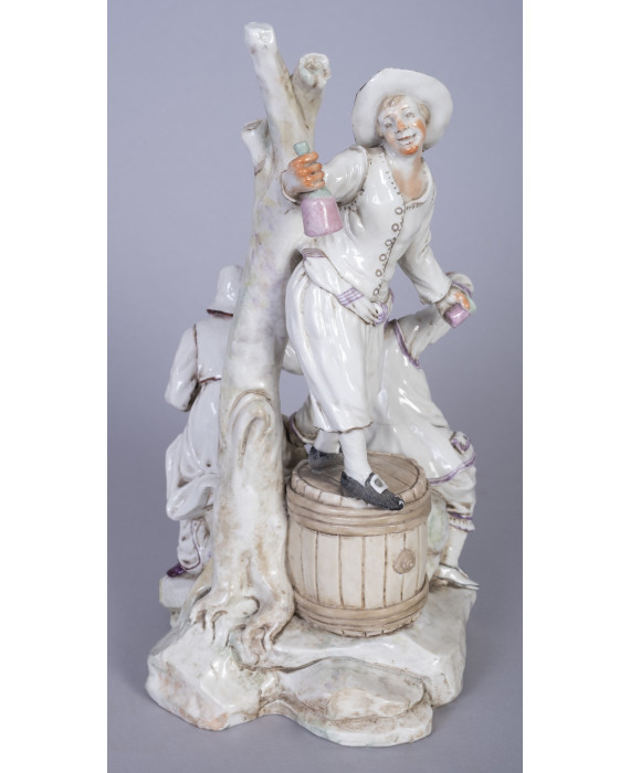 attr. Bevitori con botte e tronco d’albero. Gruppo in porcellana dipinta. Capodimonte