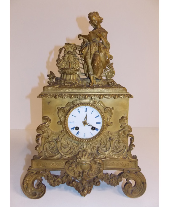 Orologio da tavolo in bronzo dorato raffigurante donna in lettura, quadrante in smalto. Francia, sec. XIX. cm43x29x12 (da revisionare)