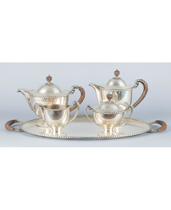 Servizio da tè e caffè in argento 800 composto da caffettiera, teiera, lattiera, zuccheriera e vassoio ovale, con pomoli e manici in legno, anse a voluta e bordi cordonati, coperchi incernierati. Bolli Milano, periodo del fascismo, argentiere Soc. An. Fabbrica Italiana Argenterie di Alignani Pasquale & Mariano. Peso tot. (compresi pomoli e manici in legno) gr. 4415 (lievi ammaccature)