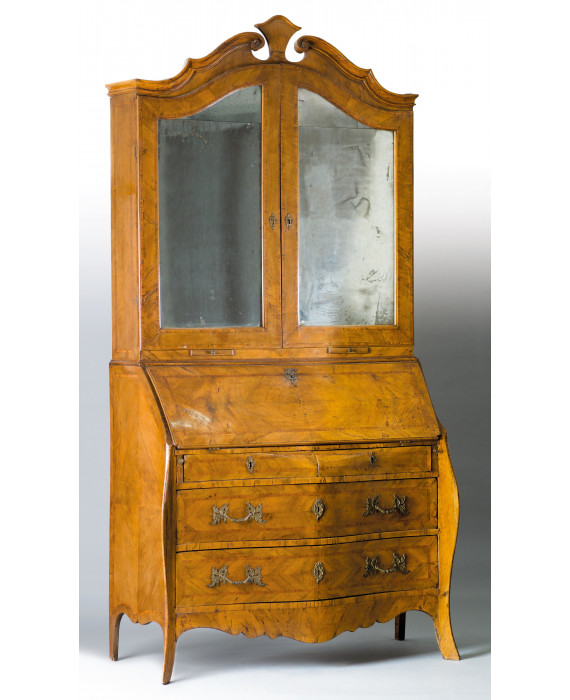 Trumeau lastronato in legno di noce e filettato in bois de rose, due sportelli a specchio superiori, due tiretti, calatoia con all'interno sette cassetti, quattro vani a giorno ed uno sportello, quattro cassetti inferiori, fronte mosso. Emilia, sec. XVIII. cm250x125x50 (difetti)
