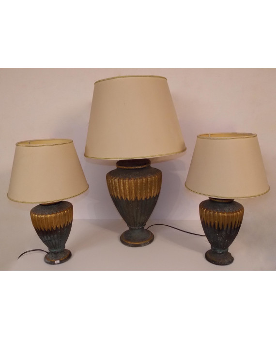Serie di tre lampade in ceramica patinata e decorata in oro con corpo scanalato e complete di paralumi in stoffa. Alt. cm40/28(2)
