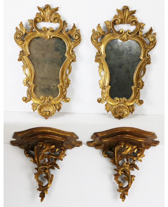Lotto di una coppia di specchierine ed una coppia di mensole in legno dorato intagliate e traforate a volute vegetali. cm37x22; cm23x26x15
